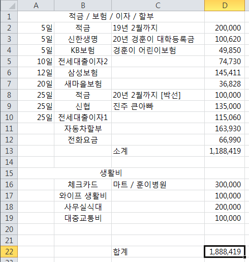 소모성 : 어린이 보험, 전세대출이자, 각종 보험, 자동차 할부, 통신요금